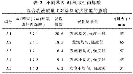 表1 超薄型鋼結(jié)構(gòu)防火涂料的基本配方 1.3涂層的制備 用500,1000號砂紙分別將80mm×80mm×1mm的Q235鋼片打磨至光亮,用3%KFD-1000金屬清洗劑溶液于80℃清洗30min后取出,烘干,備用。將防火涂料充分?jǐn)嚢韬?用毛刷涂覆在Q235鋼片的打磨面上,每次涂覆0.3~0.5mm,保持表面均勻光滑,待涂層表干后涂覆下一次,控制最終涂膜厚度不超過3mm,涂覆比約為0.15kg/m2。將涂好的試片平置,放入烘箱(25℃)內(nèi)干燥。 1.4耐火性能測試 采用垂直燃燒方法進(jìn)行簡易評價[4],這也是防火涂料研究的通用方法。 2結(jié)果與討論 2.1基料配比對耐火時間的影響 2.1.1乳液復(fù)配比例苯丙乳液做基料膨脹發(fā)泡好,但結(jié)構(gòu)疏松,空氣對流強時易吹落;環(huán)氧改性丙烯酸乳液做基料,附著力優(yōu)異,結(jié)構(gòu)堅硬致密,但膨脹發(fā)泡高度不夠。將二者結(jié)合則能克服缺點,突出優(yōu)點。表2表明,苯丙乳液與環(huán)氧改性丙烯酸乳液用量質(zhì)量比為2∶1時,涂料的耐火時間最長,發(fā)泡好,炭層堅硬致密。