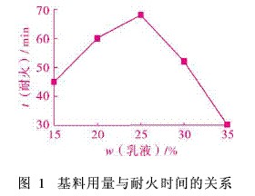 表2 不同苯丙/環(huán)氧改性丙烯酸混合乳液質(zhì)量比對涂料耐火性能的影響 2.1.2基料樹脂用量 由圖1可見,基料樹脂用量對防火涂料的耐火性能有很大影響:樹脂用量(質(zhì)量分?jǐn)?shù))為15%~25%時,耐火時間延長;繼續(xù)增加用量,耐火時間反而縮短。其原因是樹脂用量少,不能起到和基材粘結(jié)的作用,形成的炭質(zhì)層容易脫落;樹脂用量過多時,膨脹阻燃體系含量減少,不能形成很好的炭質(zhì)層。因此,適量的基料樹脂能保證很好的耐火性能;献罴延昧繛25%。