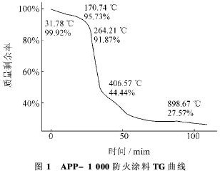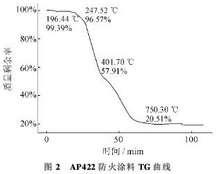 圖2 AP422防火涂料TG曲線 從兩種涂料涂層的TG曲線可以看出,雖然APP的聚合度相同,但國內原材料(APP1000)的影響還是比較明顯的,根據(jù)分析,可能是溶劑和APP的材質對試驗結果產(chǎn)生的影響,涂料低溫時的失重有可能是溶劑中的雜質和APP分子量分布較寬造成的。 |
