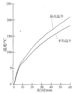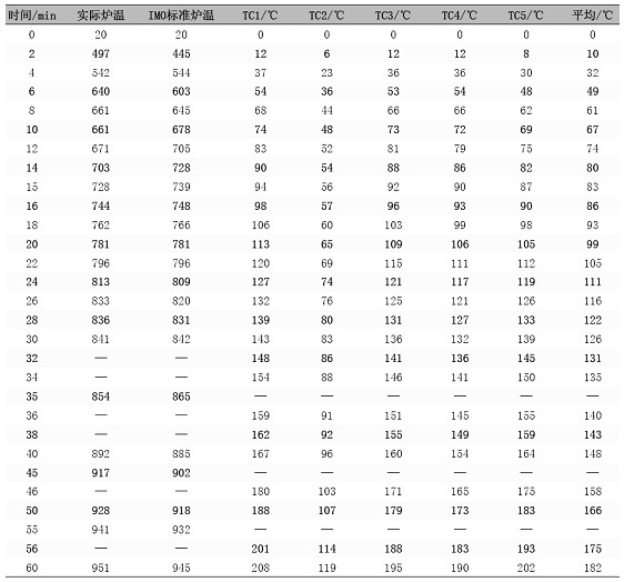 圖2實(shí)際爐溫相對(duì)于標(biāo)準(zhǔn)溫度的曲線圖 2.2.1.2試樣背火面溫度 試樣背火面溫度的升高值是防火涂料隔熱性能的判定依據(jù),根據(jù)試驗(yàn)要求試樣背火面的構(gòu)芯表面共布置了7個(gè)熱電偶,其中第1~5號(hào)熱電偶分別位于艙壁試樣4個(gè)1/4區(qū)域的中心和整個(gè)試樣的中心位置上,第6、7號(hào)分別位于兩根扶強(qiáng)材3/4高度處。試驗(yàn)過(guò)程中每只熱電偶每1~2min采集一次溫度值,圖3為試樣背火面平均及最高溫升記錄曲線,防火涂料試樣背面各熱電偶溫升及平均溫升如表2所示。試樣經(jīng)60min的標(biāo)準(zhǔn)耐火試驗(yàn),在30min末時(shí),試樣背火面的平均溫度較初始溫度的升高為126℃,5個(gè)測(cè)溫點(diǎn)中1號(hào)點(diǎn)溫度最高,為143℃,其余4個(gè)點(diǎn)的溫升分別為83℃、136℃、132℃、139℃。這表明防火涂料的隔熱性能達(dá)到了A-30級(jí)艙壁的要求。并且根據(jù)《規(guī)則》附件1第3部分要求的溫升范圍,試樣的實(shí)際隔熱性達(dá)到36min。研制的船舶用A-30級(jí)防火涂料在涂層厚度4mm時(shí)就達(dá)到了36min的隔熱性能,其使用厚度僅為普通纖維毯、防火板材等防火材料的10%。因此防火涂料用于A-30級(jí)耐火分隔材料時(shí)具有更優(yōu)良的防火隔熱效果。