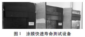 1.2涂膜的性能測試 樣板制備:將鋁板去油污、用百潔布打磨;噴涂兩遍涂料,放入履帶式烘烤線,在380℃固化15~20min。個別不能加熱固化的產(chǎn)品使用自催化型高效常溫固化劑N-7,固化劑用量為涂料質量的0.5%~2%。 許多實驗直接使用電加熱板產(chǎn)品進行測試。 涂膜的耐高溫性(自訂):將樣板放入430℃烘箱中,連續(xù)加熱120h后取出,對照未加熱樣板,觀察涂膜是否有開裂、起泡、粉化、色變等現(xiàn)象。 涂膜的快速老化壽命(根據(jù)歐盟客戶要求自訂):將噴涂了YT09涂料的加熱板部件安裝在測試角(專用設備)(見圖1)上。加熱板通電1min后升溫至340℃時立即斷電,自然降溫約30s至255℃,再次通電至340℃,將此過程設為一個周期;進行2500個周期后觀測涂膜變化。