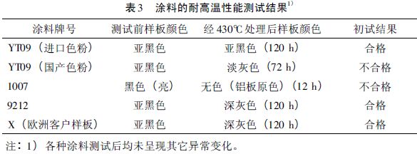 氣味測(cè)試(按歐洲客戶(hù)要求自訂):使用測(cè)試箱或面積不大于15m2、高度不大于4m、沒(méi)有異味的小房間,關(guān)好門(mén)窗,電加熱樣板以額定電壓通電,10min后檢測(cè)有無(wú)刺激性氣味析出。 2結(jié)果與討論 歐盟客戶(hù)對(duì)涂料的基本要求:一是電加熱板工作面(熱輻射面)噴涂黑色耐高溫涂料,涂層長(zhǎng)期處于400℃環(huán)境不褪色、不開(kāi)裂、不粉化、無(wú)氣味;二是符合歐盟RoHS指令及REACH法規(guī)要求。限于篇幅,本文僅討論涂料的部分關(guān)鍵性能。 2.1涂膜的耐高溫性能 表3是3種來(lái)源的涂料樣板的耐高溫性能。